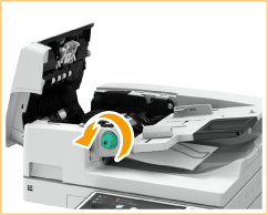 Jeśli oryginał jest zacięty, delikatnie wyciągnij go w kierunku wskazanym przez strzałkę.