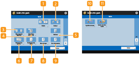 Apresenta o estado das programações como o formato do papel onde pretende imprimir e o número de impressões. Não se esqueça de confirmar as programações para uma impressão correta. Para alterar as programações, carregue no botão sob a secção de apresentação. Para alterar o número de impressões, introduza o número pretendido utilizando as teclas numéricas.