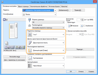[Порядок распол. страниц] [Печать односторонняя/двухсторонняя/буклет] [Расположение переплета].