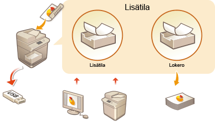 Laitteeseen asennetussa kiintolevyssä on "tallennustilaa" skannattujen asiakirjojen tallentamista, jakamista ja muokkaamista varten. Muistivälineen kytkeminen laitteeseen tarjoaa myös ulkoista tallennustilaa. Etsi ihanteellinen tallennustila tarpeittesi mukaan.