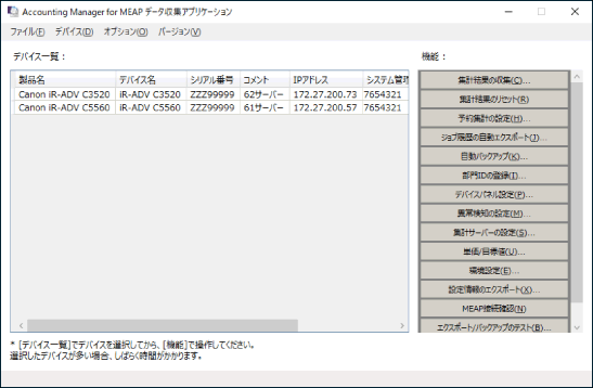 [削除] | 選択したデバイスをデータ収集アプリケーションの管理対象から削除 |