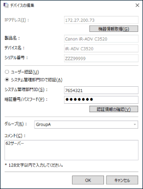 [暗証番号/パスワード] | [システム管理部門IDで認証]を選択時、デバイスに登録されているパスワードを入力 デバイスにシステム管理部門ID (システム管理者ID)のパスワード*を設定していない場合、データ収集アプリケーションは、デバイスの情報を取得することができません。デバイスのシステム管理部門ID (システム管理者ID)のパスワード*を設定してください。 * システム管理者IDがない機種の場合は、システム管理者のパスワード |