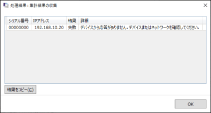 失敗 | 以下の原因でデータ収集アプリケーションとデバイスが正常に接続できない状態。詳細は、[詳細]欄に表示されたメッセージを参照してください。 デバイスが起動していない AM for MEAPがデバイスにインストールされていない ネットワークが切断されている Monitoring Toolがデバイスにインストールされていない AM for MEAPが停止している Monitoring Toolが停止している 認証情報の確認に失敗している 掲示板非対応デバイスに掲示板の設定を行った ライセンスが失効している デバイスにシステム管理部門ID (システム管理者ID)のパスワードを設定していない場合 |
