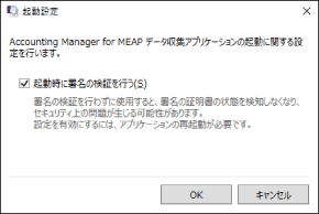 [起動時に署名の検証を行う] | チェックすると、データ収集アプリケーションの起動時に、インターネットに接続して証明書を検証 インターネットに接続できない環境の場合は、データ収集アプリケーションの起動に時間がかかります。 |
