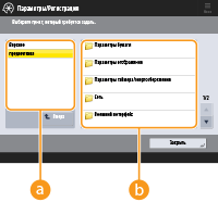 (Параметры/регистрация), чтобы отобразить экран <Параметры/Регистрация>. Сначала нажмите эту клавишу, чтобы изменить настройки, например параметры бумаги, параметры отображения и параметры сети. На этом экране также можно зарегистрировать адресатов (например, адреса электронной почты и факсимильные номера).