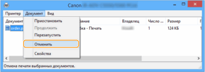 Выберите документ, печать которого необходимо отменить, и последовательно нажмите [Document]  [Cancel].