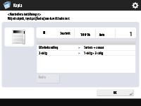 Reservera en kopiaScanning kan utföras i förväg, även om maskinen förbereds för utskrift eller skriver ut. Det här kallas för "reserverad kopiering". För att utföra reserverad kopiering medan utskrift pågår eller när vänteskärmen visas, tryck på <Stäng>, ange kopieringsinställningar på vanligt sätt och tryck sedan på