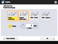 <Bygg jobb> på skärmbilden med grundläggande kopieringsfunktioner kan du använda Sortera/Gruppera även om originalet är placerat på originalglaset.Infoga ett skiljeark mellan varje sida under en grupputmatningOm du väljer <Gruppera (Samma sidor)> kan du infoga ett skiljeark mellan varje grupp. För mer information, se <Skiljeark mellan grupper>. <Kopia>