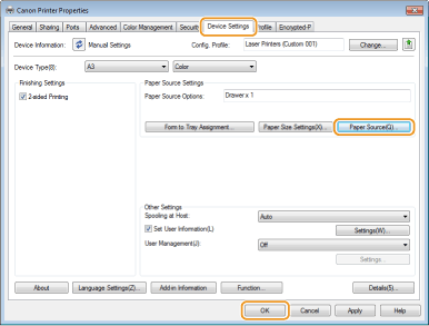Normally, it is necessary to specify the paper size and type for the paper loaded in each paper source before proceeding to printing.