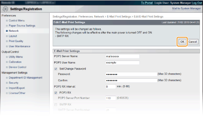 E-Mail Print allows you to print the message and attached image files of an e-mail received from the POP3 mail server without using a computer. E-mails can be manually received as well as being automatically received at regular intervals. When the SMTP protocol is used, e-mails directly sent to the machine via no mail server are printed.