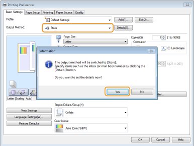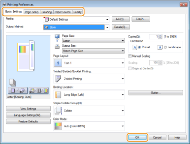 The settings changed here are stored with the document. When the document is printed next time, it is printed with the stored settings.