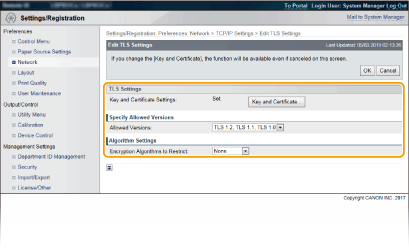 You can encrypt communication between the machine and a Web browser on the computer and the IPP Print data to print via Internet by using Transport Layer Security (TLS). TLS is a mechanism for encrypting data sent or received over the network. TLS must be enabled when the Remote UI is used for specifying settings for IPSec (Pre-Shared Key Method), IEEE 802.1X authentication (TTLS/PEAP), or SNMPv3. To use TLS encrypted communication, you need to set a key pair and enable the TLS function. Have a key pair to use ready (