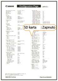 Vytiskněte Konfigurační strana a karta SD je vložena správně, pokud je možnost „Karta SD“ v části „Nabídka kontroly“ nastavena na „Zapnuto“. ![]() Pokud nejsou uvedeny žádné informace o stavu karty SD Karta SD není vložena správně. Vyjměte kartu SD ze zařízení a znovu ji vložte. | ![]() |
