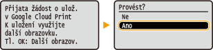 Registrace z mobilního zařízení nebo aplikace Google ChromeZařízení můžete také zaregistrovat z mobilního zařízení nebo Google Chrome. Na displeji zařízení se zobrazí následující obrazovka pro potvrzení. Pro dokončení registrace proveďte  <Ano>  . Pro provedení registrace musí být zobrazena hlavní obrazovka. Stisknutím  (  ) otevřete hlavní obrazovku a poté přejděte k registraci. Informace o postupu registrace najdete v příručce k mobilnímu zařízení nebo na webových stránkách služby Google Cloud Print. |