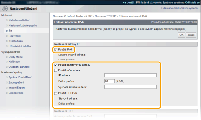 Zaškrtněte políčko [Použít IPv6] a nakonfigurujte požadovaná nastavení.