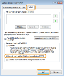 Klikněte na kartu [Služba WINS], vyberte [Povolit rozhraní NetBIOS nad protokolem TCP/IP] a potom klikněte na [OK].