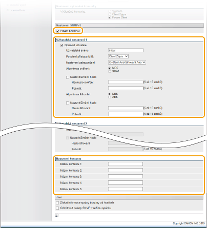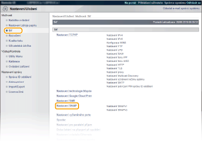 SNMP (Simple Network Management Protocol) je protokol určený k monitorování a ovládání komunikačních zařízení v síti pomocí funkce MIB (Management Information Base). Zařízení podporuje protokol SNMPv1 a protokol SNMPv3 s vylepšenými funkcemi zabezpečení. Stav zařízení lze zkontrolovat z počítače při tisku dokumentů nebo pomocí Vzdáleného uživatelského rozhraní. Můžete povolit buď protokol SNMPv1, nebo SNMPv3, případně oba současně. U každé verze zadejte nastavení odpovídající síťovému prostředí a účelům používání.