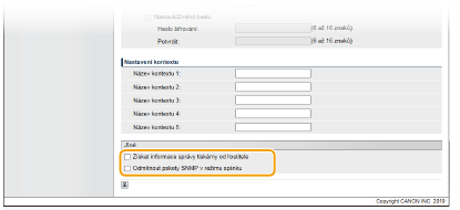 Pokud pole zaškrtnete, aplikace, které používají protokol SNMP, jako například Canon software imageWARE Series, mohou mít zakázán přístup k tiskárně.