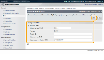 Při registraci přístroje na serveru WINS zadejte název pracovní skupiny, do které přístroj patří v síti SMB.