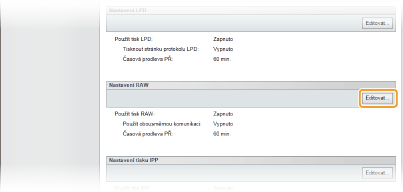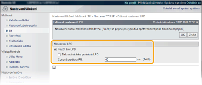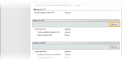 2 | Nastavení podle potřeby nakonfigurujte. ![]() [Použít tisk LPD] Pokud pro tisk používáte LPD, zaškrtněte příslušné pole. Když ho nepoužíváte, zaškrtnutí zrušte. [Tisknout stránku protokolu LPD] Zaškrtněte pole pro zahrnutí informací o uživatelském jménu a názvech souborů na výtiscích. Když tyto informace nechcete tisknout, zaškrtnutí zrušte. [Časová prodleva PŘ] Nastavte časové období, po němž tisková úloha automaticky skončí, pokud tisková data nelze přijmout v důsledku komunikační chyby nebo nějakému jinému problému. |