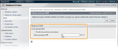 2 | Nastavení podle potřeby nakonfigurujte. ![]() [Použít tisk RAW] Používáte-li k tisku formát RAW, zaškrtněte políčko. Pokud službu IPP nepoužíváte, zaškrtnutí políčka zrušte. [Použít obousměrnou komunikaci] Když používáte obousměrnou komunikaci k informování počítače o stavu tiskárny a dokončení tisku, zaškrtněte dané pole. Když ho nepoužíváte, zaškrtnutí zrušte. [Časová prodleva PŘ] Nastavte časové období, po němž tisková úloha automaticky skončí, pokud tisková data nelze přijmout v důsledku komunikační chyby nebo nějakému jinému problému. |