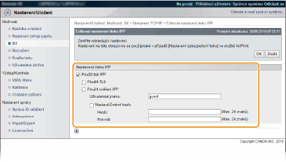2 | Nastavení podle potřeby nakonfigurujte. ![]() [Použít tisk IPP] Pokud pro tisk používáte IPP/IPPS, zaškrtněte příslušné pole. Když ho nepoužíváte, zaškrtnutí zrušte. [Použít TLS] Pokud pro tisk používáte IPPS (tisk IPP se šifrovanou komunikací TLS), zaškrtněte příslušné pole. Když ho nepoužíváte, zaškrtnutí zrušte. ![]() Při používání protokolu IPPS povolte funkci šifrované komunikace TLS. Používání TLS pro šifrovanou komunikaci ![]() Pokud vyberete [RSA] pro [Algoritmus klíče] s generováním klíče pro síťovou komunikaci, nastavte délku klíče [1024 bitů] nebo delší. Tisk IPPS možná nebude správně proveditelný, pokud je nastavena délka klíče [512 bitů], v závislosti na používaném operačním systému. [Použít ověření IPP] Když používáte funkci ověření uživatele pro tisk IPP, zaškrtněte pole a nastavte uživatelské jméno a heslo. Když ho nepoužíváte, zaškrtnutí zrušte. [Uživatelské jméno] Zadejte alfanumerické znaky pro uživatelské jméno použité při ověřování IPP. [Nastavit/Změnit heslo] Chcete-li zadat nebo změnit heslo, zaškrtněte toto políčko a formou alfanumerických znaků zadejte heslo do textového pole [Heslo]. Heslo potvrďte jeho opětovným zadáním do textového pole [Potvrdit]. |