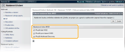 2 | Nastavení podle potřeby nakonfigurujte. ![]() [Použít tisk WSD] Pokud pro tisk používáte WSD, zaškrtněte příslušné pole. Když ho nepoužíváte, zaškrtnutí zrušte. [Použít procházení WSD] Políčko zaškrtněte, pokud chcete získávat informace o zařízení z počítače pomocí protokolu WSD. Toto políčko se automaticky zaškrtne, je-li zaškrtnuto políčko [Použít tisk WSD]. [Použít Multicast Discovery] Políčko zaškrtněte, pokud chcete nastavit zařízení tak, aby odpovídalo na požadavky na zprávy vícesměrového zjišťování. Pokud je zaškrtávací pole prázdné, přístroj zůstane v režimu spánku, i když na síti běží zprávy vícesměrového zjišťování. |