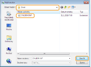 4 | Určete složku, která obsahuje přídavné ovladače, vyberte soubor INF a potom klikněte na [Otevřít]. ![]() Podle operačního systému tiskového serveru vyberte složku, jak je to uvedeno níže. Pokud tiskový server používá 32bitový operační systém Vyberte složku [UFR II]-váš jazyk-[x64]-[Driver] na disku Disk CD-ROM/DVD-ROM s uživatelským softwarem. Pokud tiskový server používá 64bitový operační systém Vyberte složku [UFR II]-váš jazyk-[32BIT]-[Driver] na disku Disk CD-ROM/DVD-ROM s uživatelským softwarem. | ||||||
