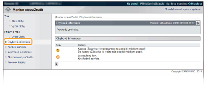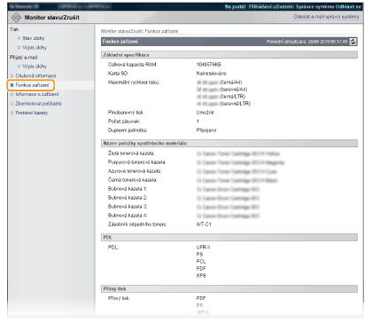 Když je do tiskárny vložena jakákoli volitelná karta SD, historie se vymaže, když se provede vypnutí nebo reset tiskárny. Pokud se do přístroje přihlásíte v obecném uživatelském režimu, když je aktivní funkce [Povolit proces úlohy běžného uživatele] nezobrazí se název dokumentu pro jiné úlohy, než je ta vaše; místo toho se zobrazí hvězdičky, například „********“. Umožnění manipulace s dokumenty koncovým uživatelům |