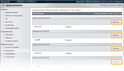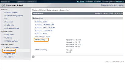 Použití ovládacího paneluFiltrování IP adresy můžete povolit nebo zakázat také z nabídky nastavení na ovládacím panelu. Filtr adresy |