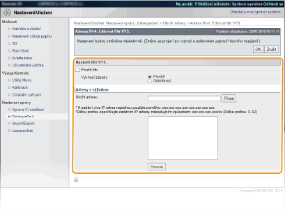Úprava zadané adresy IP ze seznamu výjimek Klikněte na odpovídající textový odkaz pod položkou [Adresy s výjimkou] na obrazovce, která se zobrazí, změňte podle potřeby nastavení, a klikněte na možnost [OK]. Odstranění adresy IP ze seznamu výjimek Vyberte adresu IP, kterou chcete vymazat, a klikněte na možnost [Smazat]. |