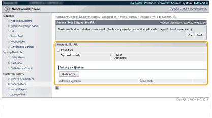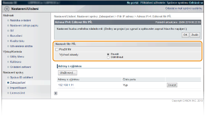 4 | Zaškrtněte políčko [Použít filtr] a kliknutím na přepínač [Odmítnout] nebo [Povolit] nastavte [Výchozí zásady]. [Použít filtr] Pole zaškrtněte, pokud chcete komunikaci omezit. Zrušením zaškrtnutí políčka omezení zakážete. [Výchozí zásady] Vyberte, zda se má povolit nebo odmítnout komunikace jiných zařízení s tímto zařízením. [Povolit] | Pokud vyberete tuto možnost, pak komunikační pakety, které jsou odeslány nebo přijaty ze zařízení, jejichž IP adresy jsou uvedeny v seznamu [Adresy s výjimkou], budou blokovány. Komunikace s ostatními zařízeními je povolena. | [Odmítnout] | Pokud vyberete tuto možnost, pak projdou pouze komunikační pakety, které jsou odeslány nebo přijaty ze zařízení, jejichž IP adresy jsou uvedeny v seznamu [Adresy s výjimkou]. Komunikace s ostatními zařízeními je zakázána. |