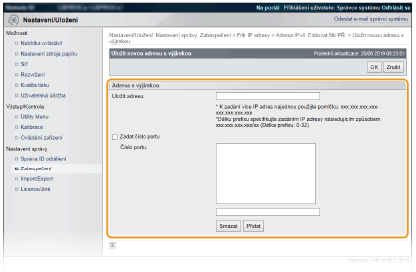 2 | Zadejte adresy do seznamu výjimek. Zadejte IP adresu (nebo rozsah IP adres) do pole [Uložit adresu]. Chcete-li zadat číslo portu, zaškrtněte políčko [Zadat číslo portu]; zadejte číslo portu do [Číslo portu] a klikněte na [Přidat]. Kontrola správnosti zadaných adres Pokud zadáte IP adresy nebo čísla portů nesprávně, nemusí být možné se k zařízení připojit prostřednictvím Vzdáleného uživatelského rozhraní. V takovém případě je třeba nastavit <Filtr adresy> na <Vyp>. Filtr adresyVymazání nastaveného čísla portu Vyberte číslo portu, který chcete vymazat, a klikněte na [Smazat]. |