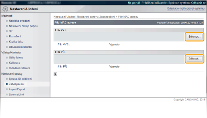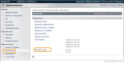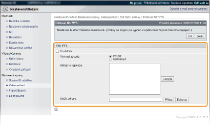 Jednotlivé adresy není nutné oddělovat pomlčkami nebo dvojtečkami. Kontrola správnosti zadaných adres Pokud zadáte MAC adresy nesprávně, nebude možné se k zařízení připojit prostřednictvím Vzdáleného uživatelského rozhraní. V takovém případě je třeba nastavit <Filtr adresy> na možnost <Vyp>. Filtr adresy Když jste vybrali [Odmítnout] v části [Výchozí zásady] Odchozí pakety vícesměrového a všesměrového vysílání nelze filtrovat. Odstranění adresy MAC ze seznamu výjimek Vyberte adresu MAC a klikněte na možnost [Smazat]. |