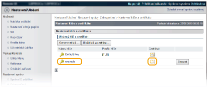 Pokud je pár klíčů z nějakého důvodu aktuálně používán, např. pokud se pod položkou [Použití klíče]zobrazuje informace „TLS“ nebo „IEEE 802.1X“, pak tento pár klíčů nelze smazat. V takovém případě je před smazáním nutné příslušnou funkci zakázat nebo vyměnit.