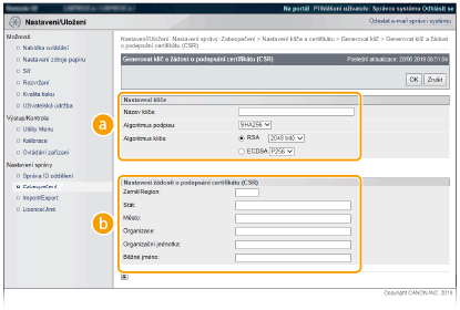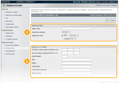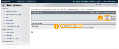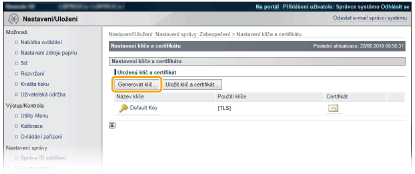 Pokud šifrovaná komunikace probíhající prostřednictvím protokolu Transport Layer Security (TLS) vyžaduje pár klíčů, je možné ho pomocí zařízení vygenerovat. Protokol TLS lze použít při přístupu k zařízení prostřednictvím Vzdáleného uživatelského rozhraní nebo při tisku IPP. Pro zařízení je možné registrovat až osm párů klíčů, včetně předinstalovaných párů. Certifikáty podepsané svým držitelem jsou používány s páry klíčů vygenerovanými pomocí možnosti „Komunikace v síti“. Pomocí možnosti „Klíč a žádost o podepsání certifikátu (CSR)“ můžete požádat o digitální certifikát od certifikační autority pro pár klíčů vygenerovaný zařízením.