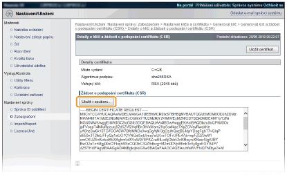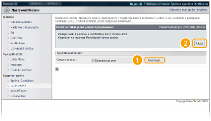 Klikněte na tlačítko[Procházet] v [Cesta k souboru], zadejte soubor, pro který chcete žádat o podepsání certifikátu (CSR), a klikněte na tlačítko [Uložit].