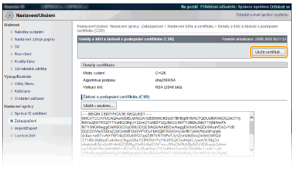 Pár klíčů vygenerovaný žádostí o podepsání certifikátu (CSR) nemůžete použít, dokud nebude certifikát uložen. Jakmile certifikační autorita vystaví digitální certifikát, uložte jej podle následujících pokynů.