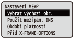 ![]() | Položky nastavení týkající se hlavní obrazovky na MEAP jsou uvedeny s krátkým popisem. Výchozí nastavení jsou označena křížkem ( ). |