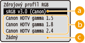 sRGB v3.0 (Canon)  Canon HDTV gama 1,5 Canon HDTV gama 1,8 Canon HDTV gama 2,4 Žádný |