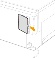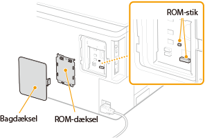 Dette afsnit beskriver, hvordan man installerer ekstra ROM i maskinen. ROM bruges tilsluttet ROM-stikkene bag maskinens bagdæksel. Læs forholdsreglerne i Installation, før du installerer ROM. | ![]() |