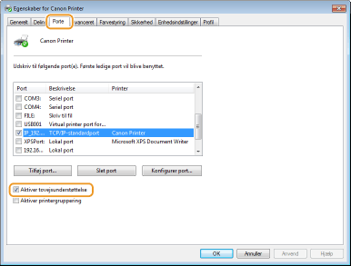 På fanen [Porte] skal du kontrollere, at afkrydsningsfeltet [Aktiver tovejsunderstøttelse] er valgt.