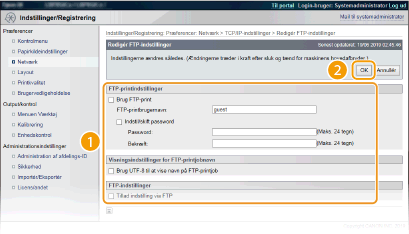 Markér afkrydsningsfeltet for at tillade indstilling af ændringer for maskinen via FTP-klient. Når du ikke vil tillade indstilling af ændringer, skal du fjerne markeringen i afkrydsningsfeltet.