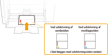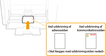 Sørg for at udjævne eventuelle krøllede kuverter eller postkort, før du ilægger dem. Vær også opmærksom på retningen af kuverterne eller postkortene, og hvilken side der vender opad. Bemærk, at der ikke kan lægges kuverter eller postkort i papirskuffen.