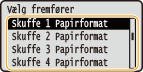 <Skuffe 2 Papirformat> til <Skuffe 5 Papirformat> vises, når den valgfri papirfremfører eller kassetteindføringsenhed er installeret.