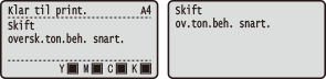 Hvis meddelelsen <Klar til print.> ikke vises, standses udskrivningen midlertidigt. For at genoptage udskrivningen skal du trykke på  (  ). Hvilken meddelelse, der skal vises på displayet, afhænger af indstillingen <Handling v. advarsel> i indstillingsmenuen på kontrolpanelet. Handling v. advarsel |