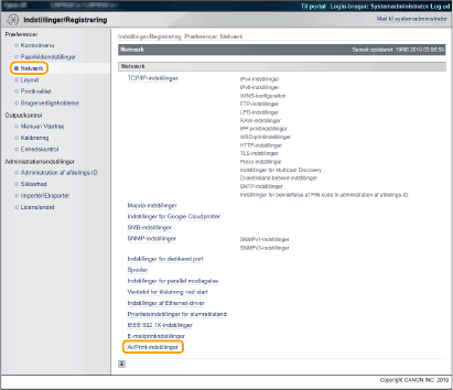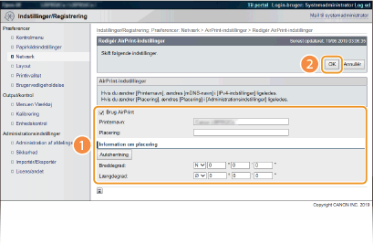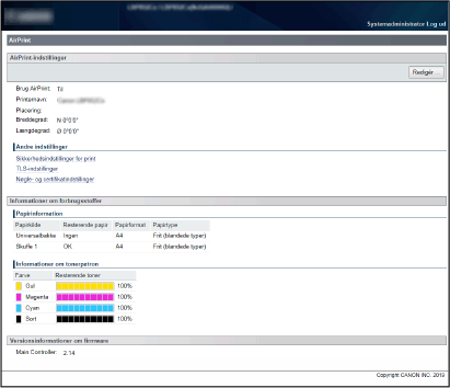 Du kan registrere oplysninger, herunder navnet på maskinen og installationsplaceringen, der bruges til at identificere maskinen. Du kan også deaktivere maskinens AirPrint-funktion. Brug Brugerinterface til fjernbetjening til at ændre disse indstillinger.