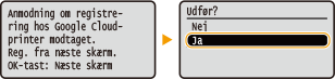 Registrering fra en mobil enhed eller Google ChromeDu kan også registrere maskinen fra en mobilenhed eller Google Chrome. Maskinens display viser følgende bekræftelsesskærm, før registreringen færdiggøres. Udfør  <Ja>  for at færdiggøre registreringen. For at udføre registreringen skal hovedskærmen vises. Tryk på  (  ) for at få vist hovedskærmen, og fortsæt derefter til registreringen. Du kan finde registreringsproceduren i betjeningsvejledningen til din mobile enhed eller på webstedet for Google Cloud Print. |
