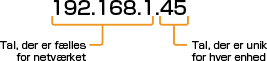 En IP-adresse består af fire tal, der er adskilt af et punktum (.) (eksempel: 192.168.1.45). Hvert tal skal være i området mellem 0 og 255. Generelt skal de første tre tal indstilles til de samme som dem for routeren, fordi de er fælles for netværket. Fastlæg det sidste tal (f.eks. 45 i 192.168.1.45), der er forskelligt fra de andre enheders.