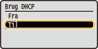 3 | Vælg <Brug DHCP>, <Brug BOOTP> eller <Brug RARP>, og tryk på . Du kan kun bruge én af protokollerne DHCP, BOOTP og RARP. Hvis den valgte protokol er indstillet til <Til>, indstilles de to andre protokoller automatisk til <Fra>. |